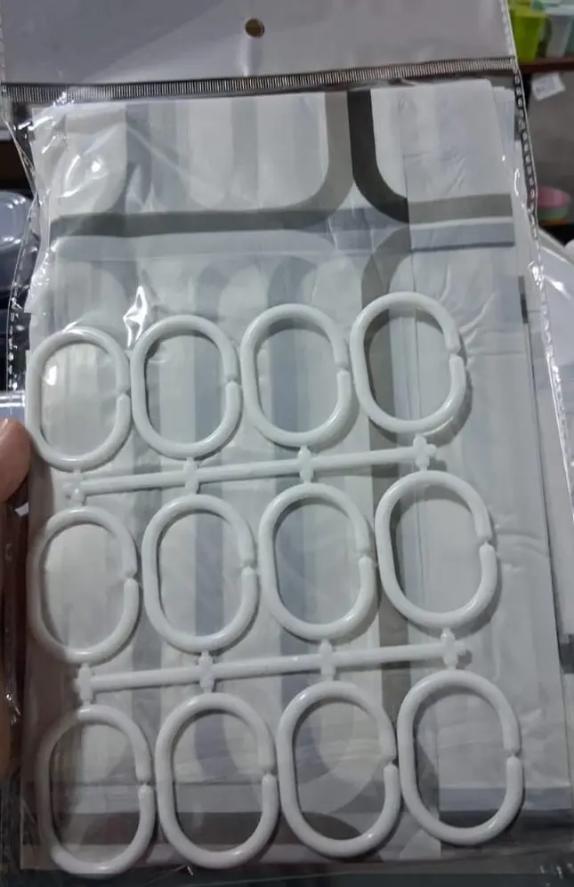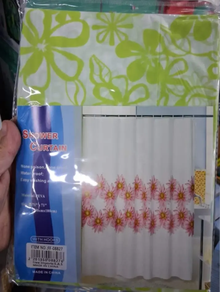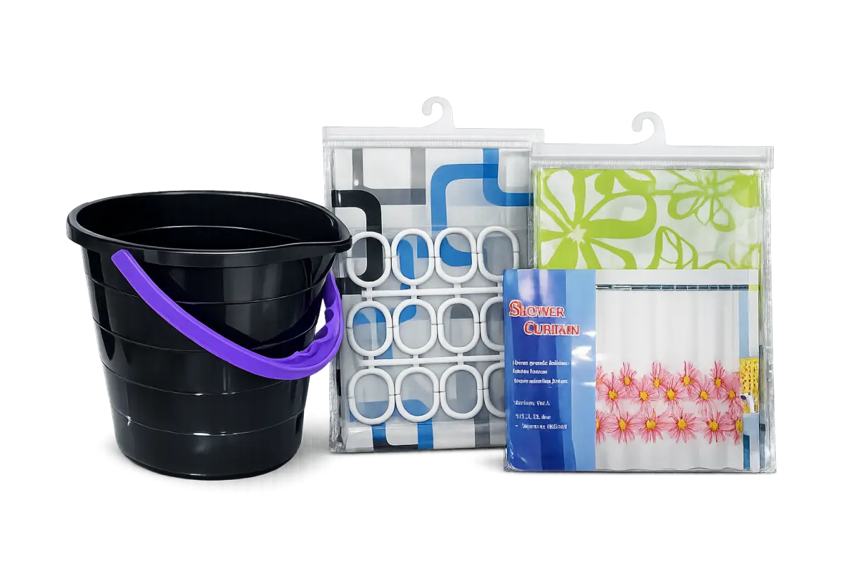 - Contenido: 1 balde plástico + 2 cortinas de baño con ganchos