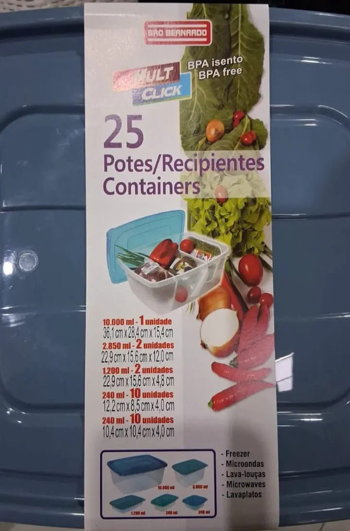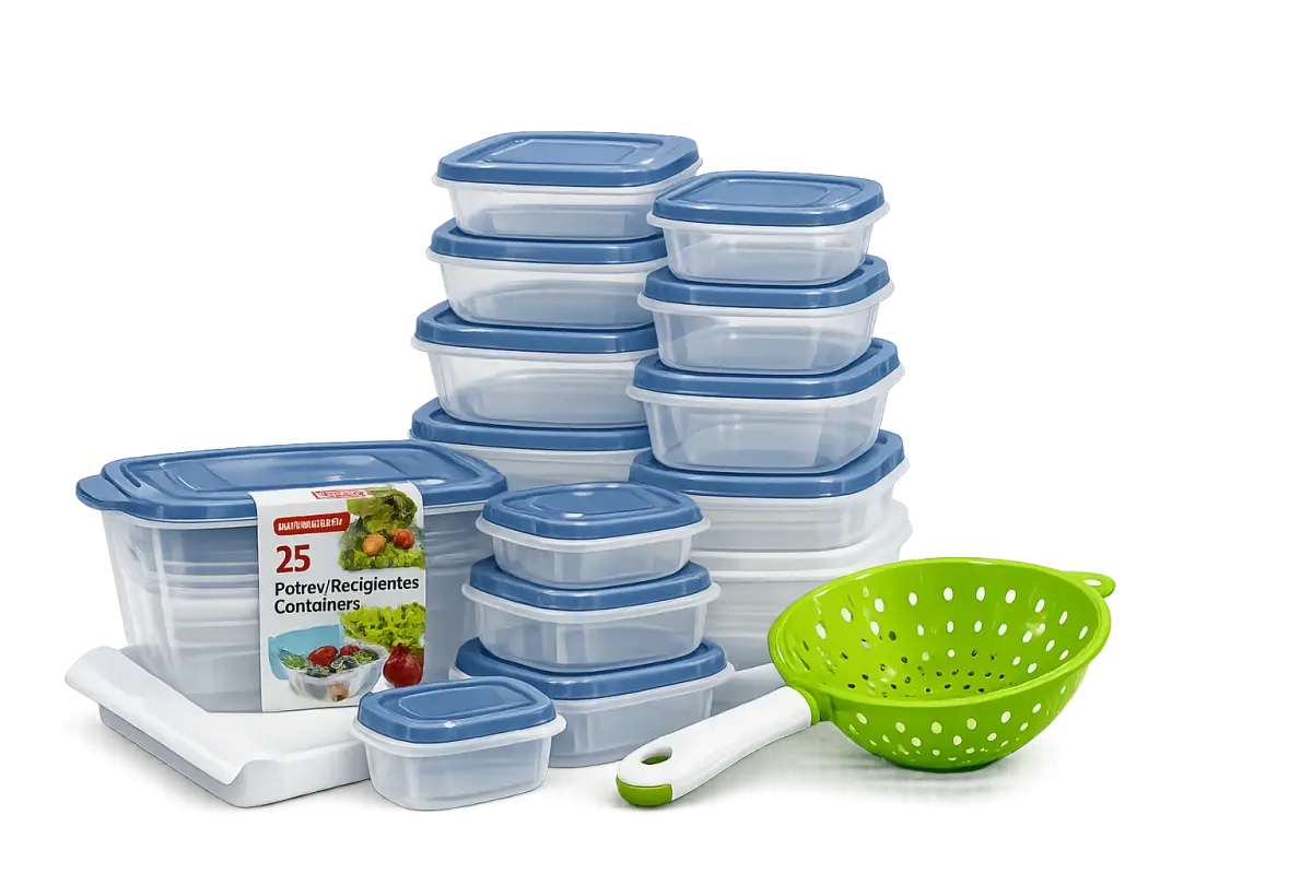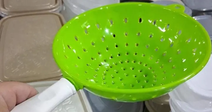 Colores: Tápers transparentes con tapa azul / colador verde con mango blanco